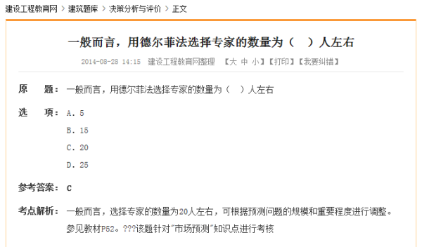 正确答案:C 解析:德尔菲法的关键之一在于决定适当的专家人数,一般10~50人较好。特尔菲法一般以多少人为宜