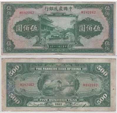 中国农民银行,中华民国三十年,美国银行印制,1941年发行的500 纸币 请问能值多少钱啊?