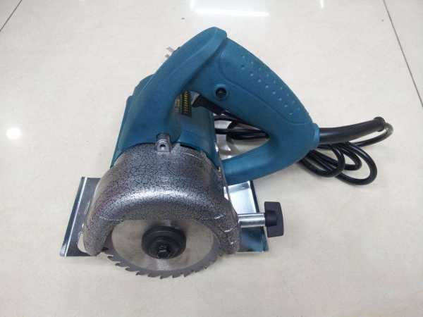 电动石材切割机使用金刚石锯片。其切割原理通过片缘高速线速度形成连续细小的撞击力切入材料内,藉刀片缘部粘接剂表面凸出的金刚石微粒撞击工件而进行切割从材料上凿碎下来的小切屑粒摩擦粘接剂表面,导致新的金刚石粒凸起部分的形成,就这样自动、连续地进行新的切割。