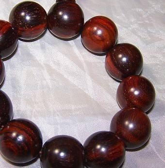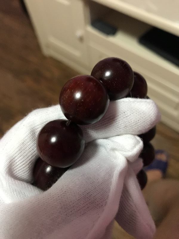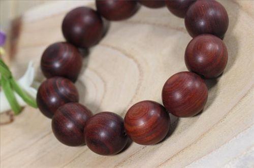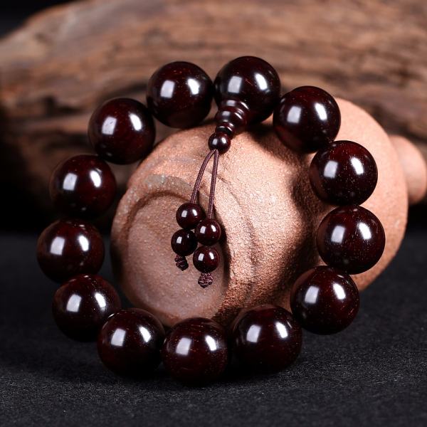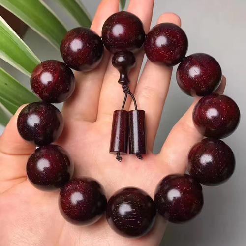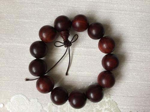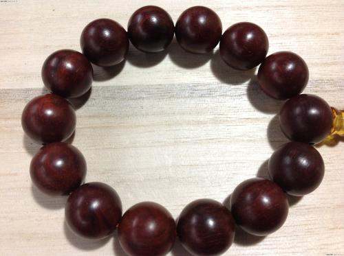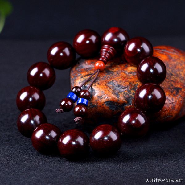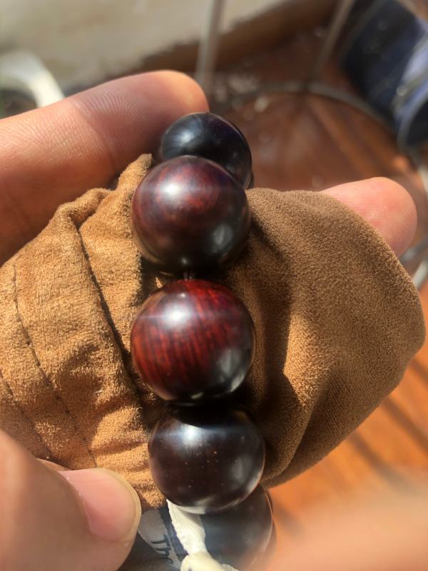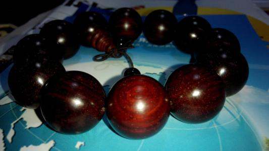 这串是血檀材质的、血檀,又名,赞比亚紫檀,目前未被列入国标红木5属8类29种红木里,属于硬木。但是由于血檀的密度,油性各方面与红木接近,很多新中式家具生产厂商,将其用作原料。