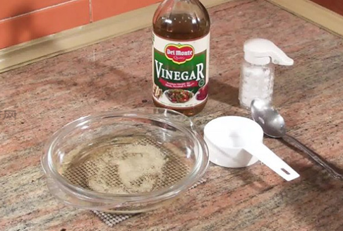 1、将盐与醋按1比10的比例倒入小盆中调和,搅拌直至盐完全溶解。