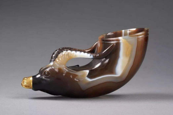 唐代酒器,国之重宝。玛瑙杯选材精良,巧妙利用玉料的俏色纹理雕琢而成,杯体为角状兽首形,兽双角为杯柄,嘴部镶金帽,眼、耳、鼻皆刻划细微精确。从选材、设计到工艺,都可称得上唐代玉雕艺术的精品。是至今所见的唐代唯一一件俏色玉雕,是唐代玉器做工最精湛的一件,也是唐代中外文化交流的产物。