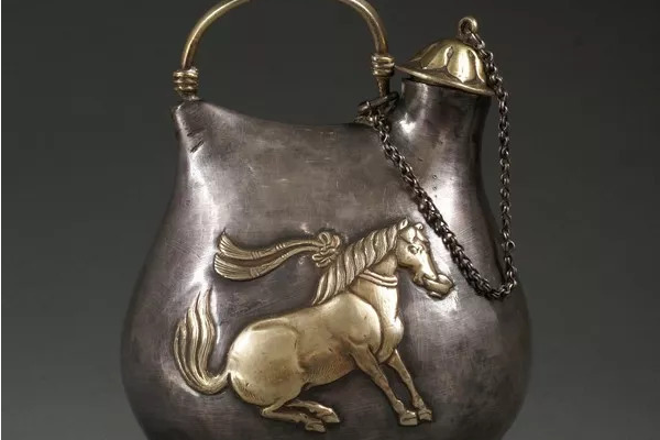 壶的造型采用的是我国北方游牧民族皮囊的形状,壶身为扁圆形,一端开有竖筒状的小口,上面置有覆莲瓣式的壶盖,壶顶有银链和弓形的壶柄相连。这种形制,既便于外出骑猎携带,又便于日常生活使用。银壶的两侧采用凸纹工艺各塑造出,一匹奋首鼓尾、跃然起舞的骏马,表现了唐代工匠在设计上的独具匠心。