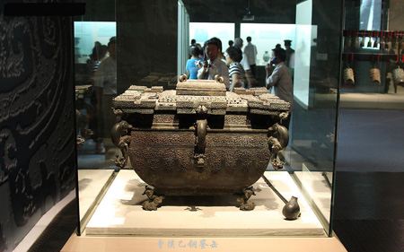 湖北省博物馆的曾侯乙青铜冰鉴就更著名了,就是个可以放冰可以放水的大铜盆。铜盆里放入装酒的器物,在四周放冰就是冰镇酒,放热水就是加热酒。右侧是舀酒的铜勺。