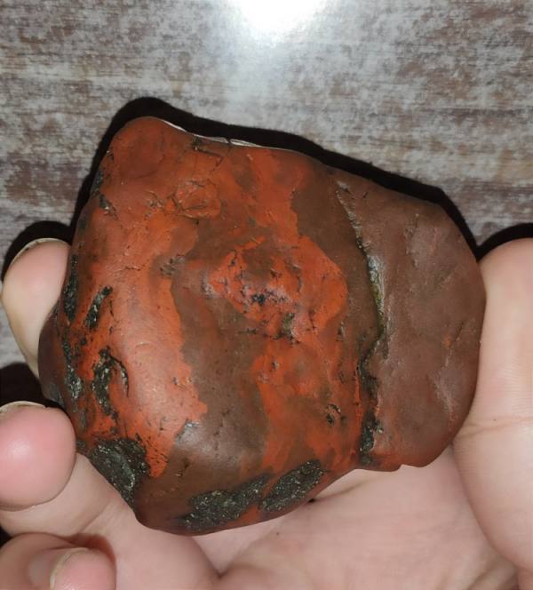 赭石,为鲕状、豆状、肾状集合体,多呈不规则的扁平块状。赭石是氧化物类矿物刚玉族赤铁矿,主含三氧化二铁(Fe2O3)。暗棕红色或灰黑色,条痕樱红色或红棕色,有的有金属光泽。