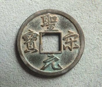 篆书体圣宋元宝,宋徽宗赵佶建中靖国元年(公元1101年)始铸,“圣宋元宝”钱有小平,折二对钱多种。钱文以篆书、行书两种书体书写、字多变化,皆为旋读。圣宋元宝行、篆书折二光背 10元左右。