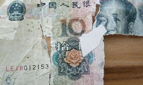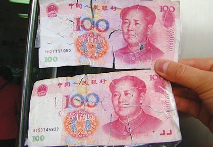 2:人民币在流通的过程中,多少都会出现一些破损,而大部分纸币的破损都是非人为因素造成的。出现破损或者部分被撕裂的情况,用透明胶粘一下,银行是不会收这类纸币的。从法律上来说,银行是有义务兑换破损纸币的,因此我们的纸币如果被破坏或者损坏了,都可以去就近的银行进行兑换。