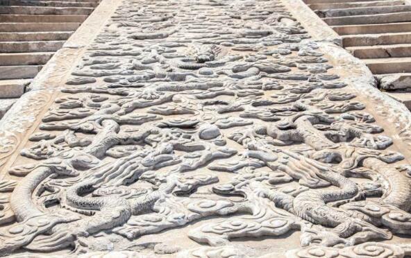 意思是象征着九五之尊,在这块巨大的御路石上,雕刻着9条凌空飞舞的巨龙,它们或升或降,高高地突起在巨石的表面,造型十分生动。巨龙身下是万朵云霞。石雕的下部有5座宝山,宝山之川是流畅的水纹。整块石雕运用了各种不同的雕刻手法,变化有致,主次分明。