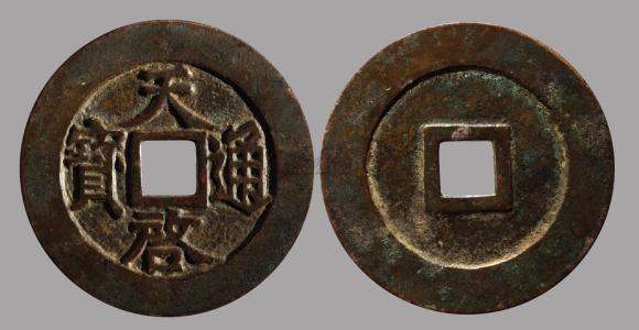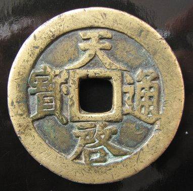 徐寿辉公元1358年铸“天启通宝钱”,该币质地为紫铜,就式样有小平钱、折二钱、折三钱三种,元天启钱“天”字饱满有力,尤其一捺,刚劲有力,非大手笔不能为之;“启”字繁体结构中的“户”字,非常特别为横户。