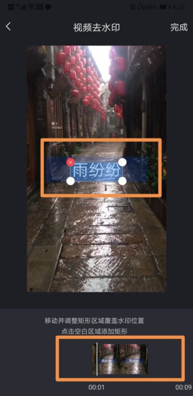 4、水印去除的画面和范围,都选取好后,点击右上角的“完成”。