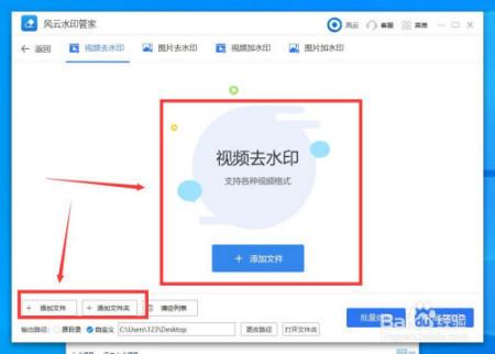 进入之后,点击中间的“添加文件”选项将要加水印的视频加入,或者点击左下方的“添加文件夹”选项将整个文件夹导入。