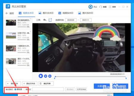 设置“输出路径”,勾选原目录即可,会保存到我们在桌面建立了新的文件夹选择“矩形工具”将要去水印的地方圈出。