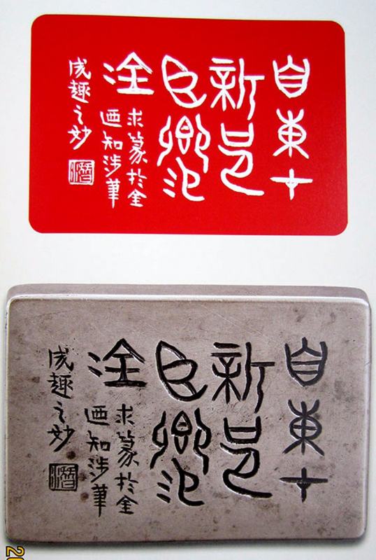 民国大书家杨潜庵书“求篆于金”墨盒(载《民国刻铜文房珍赏》169页),节录了西周早期臣卿鼎铭文“自东,才(在)新邑,臣卿易(赐)金”9字后【原来铭文是:公违眚(省)自东,才(在)新邑,臣卿易(赐)金,用乍(作)父乙宝彝】,加题“求篆于金,乃知涉笔成趣之妙”。