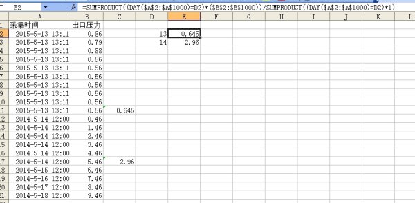 =SUMPRODUCT((DAY($A$2:$A$1000)=D2)*($B$2:$B$1000))/SUMPRODUCT((DAY($A$2:$A$1000)=D2)*1)。然后下拉填充公式即可。效果如图