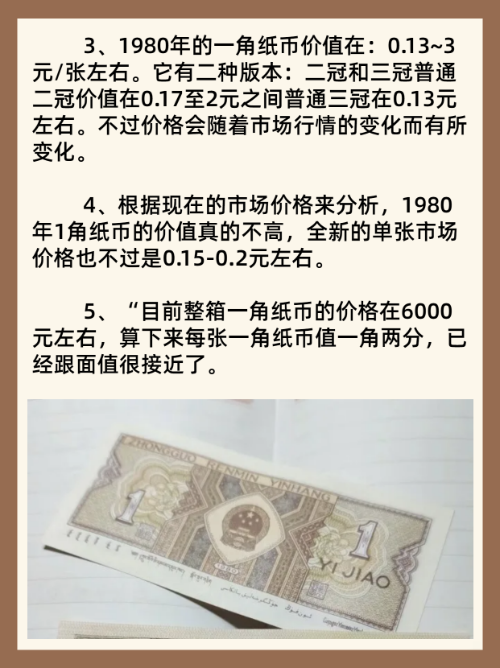 1980年的一角纸币价值在0.1万元左右。1980年的一角纸币值多少钱?
