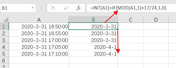 =INT(A1)+IF(MOD(A1,1)>17/24,1,0)