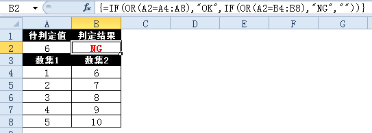 =IF(OR(A2=A4:A8),"OK",IF(OR(A2=B4:B8),"NG",""))