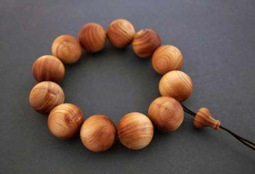 崖柏手串中的每一颗珠子上都分布有“水波纹”,则可称为“水波纹”崖柏手串。一般“水波纹”品质的手串油性相对比干料更好些,气味自然更为浓郁些。