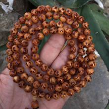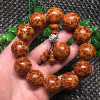 崖柏手串每一颗珠子上都带有少量的瘤纹或“雀眼”,同时分布有少量“火焰纹”,这种级别的崖柏手串称为带瘤手串。文玩崖柏手串的卖点在于“瘤纹”,因此带瘤崖柏手串价值虽不算高,但也要高于“水波纹”和干料。