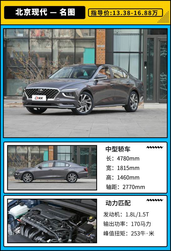 全新名图定位品牌旗下B级轿车,其指导售价为13.38-16.88万,在终端市场表现之中全新名图的价格已经拉低至十五万左右的竞争级别,加之全新换代的产品升级,全新名图在未来能否在B级车市场成为一段佳话呢?有关于这台全新名图的方方面面且听买买君娓娓道来。