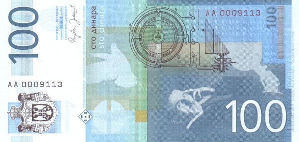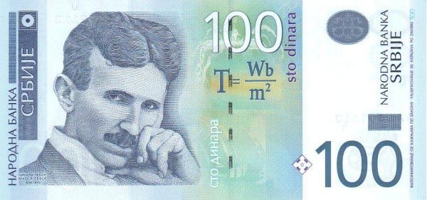 这是塞尔维亚的100第纳尔纸币。纸币正面是塞尔维亚裔美籍科学家,电气工程师和发明家特斯拉,背面是特斯拉与他发明的电磁感应机。目前塞尔维亚第纳尔与人民币无直接兑换率,所以是兑换不了钱的。不过有收藏价值,全新一张在邮币交易市场上价值35元人民币左右。