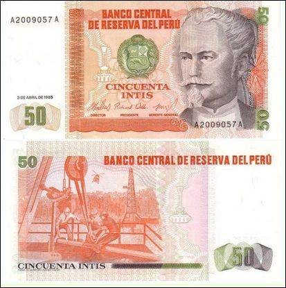 这是秘鲁上世纪80年代发行的50印蒂(INTIS),是已经停止流通的旧币。“cincuentaintis”是西班牙语“五十印蒂”的意思。