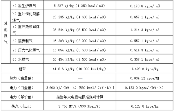 为了便于将各种能源的实物量换算成标准量,需要对能源进行抽样实测,求得平均低位发热量,然后再与能源标准量对比,计算出这种能源的折标准煤换算系数。将系数乘以实物数量,即得该种能源的标准煤数量。国家公布的参考标准如下表: