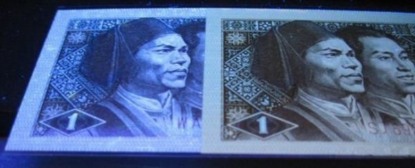 荧光灯下呈现双面强白荧光反应;在荧光灯下看是否存在荧光纤维丝或者祥云,纸币反面四周比较容易看出。