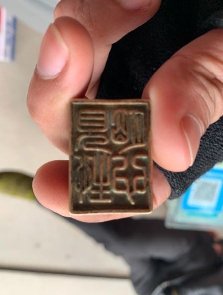 从照片看,这是一枚龟钮的金属印章,材质像铜,内容为小篆字体的:明心见性。从内容看,不是名章或官印,属于闲章。