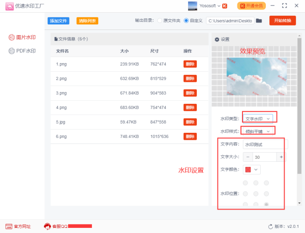 第3步,添加好图片后进行设置,如下图所示:水印类型选择“文字水印”;然后设置水印样式,一共有四种,根据自己的需求设置;接下来输入文字内容;最后设置文字的大小/颜色/透明度/位置等参数。上方可以预览到添加文字水印后的样子。