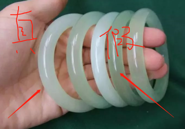 3.听声音:两支仿品手镯互相轻轻敲击会有玻璃撞击的声音;而真岫玉手镯是石质感的声音,比较敦实,当然质地通透的好岫玉手镯相对质地一般的手镯声音会更清脆些,但依然有别于玻璃的声音。下图为假岫玉: