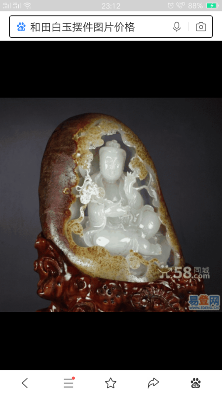 现在的羊脂玉分两种 一种是鉴定机构鉴定证书上标示的羊脂玉 这个只要是白度达到一定程度的广义和田玉都能叫羊脂玉 比如白度较好的青海料,也能出羊脂玉的证书,这样的料子,行内克价50~100 但是和田玉玩家或者行内,是不认这种羊脂玉的 行内的羊脂玉首先是和田籽料,然后是白度、细度、润度、老熟度等指标统统到位的籽料才能被称为羊脂玉 这样的羊脂玉行内克价在2000~10000,这样说你该明白了吧 说到这些指标,是要求你个人对和田玉有一定的鉴赏能力的 这个就不是三两句话说的透的,等你玩入行了,这些就不是问题了 你这个摆件没有任何籽料特征,所以应该是山料 雕刻风格应该是揭阳或者台湾的镂空雕法 这个雕工比较细这个摆件是什么材质的呢?玉石?石头?