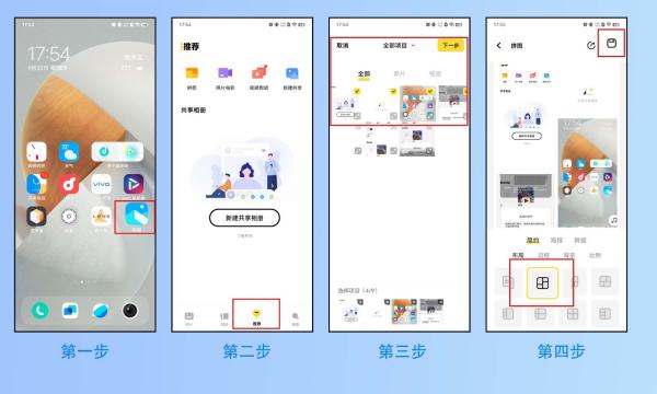 1、进入相册--推荐--拼图--选择图片--下一步--选择模板--保存即可;