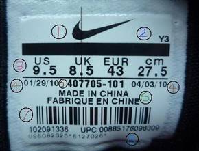 第四部分为日期栏,改部分也是新老标差异比较大的一个地方,老标的特点是左右日期不平行,且左边日期与其上方横线的距离比右边日期要近。但在新标中,左右日期平行了,这又回到了05年圈C多出M半个身位鞋标类型的日期平行方式。其实这一点早在08年FJ产的Air Max Assail III以及Vela II AP鞋标中有所预兆,当时,出现的那种鞋标不少人认为是假货,因为鞋标的工厂代码以及日期平行出现了“复古”的情况,后来经过专柜对比,标是真标。当时,我就认为NIKE可能要更新鞋标了,只不过是在个别工厂的产品内小范围实验。如今是真的验证了这一点,在2010年的新标中,日期平行的方式与08年FJ产的那批产品完全一致。并且在新标中,0与日期分隔线的距离比1近的说法依然使用,以数字分类为排序的话,2和3与日期分隔线的距离最近,0与日期分隔线的距离次之,1与日期分隔线的距离最远。