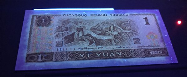 96版1元纸币中的无色荧光纤维丝是在制造钞纸时有意添加进去,制造成无色荧光纤维钞纸。无色纤维丝有的是弯曲的细丝、有的是相对粗直不弯曲的直丝,直丝属于非金属合金丝。无色纤维丝在自然光、自然灯光下是肉眼看不到,无色纤维丝在紫光灯下就显现白色的纤维丝。查找无色荧光纤维钞纸,得知世界上最早使用无色荧光纤维印钞纸的是德国。美元使用红蓝纤维印钞纸是在1928年(红蓝纤维是无色荧光纤维上色形成)。中国制造、试验无色荧光纤维印钞纸是在上世纪80年代末90年代初:1992年成功印刷无色荧光纤维纸币WA 8001,1993年3月成功印刷无色荧光纤维纸WH 8001。1996年中国无色荧光纤维印钞纸研究试验取得成功。