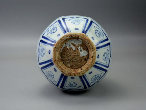 饱满类型的装饰,无论圆、琢器,全器被青花纹饰所覆盖,有的器身布满青花纹饰达8层之多,以此突出表现元青花的壮美之感。元青花饱满型装饰的另一种表现形式是通体以卷枝纹或海水纹为地,突出白色的花纹或在地纹上作菱形曲线开光,开光内绘一主题纹饰。这种饱满设计方法多在八棱器上体现,看似繁缛,实则安排有序,具有强烈的美学效果和时代风格。