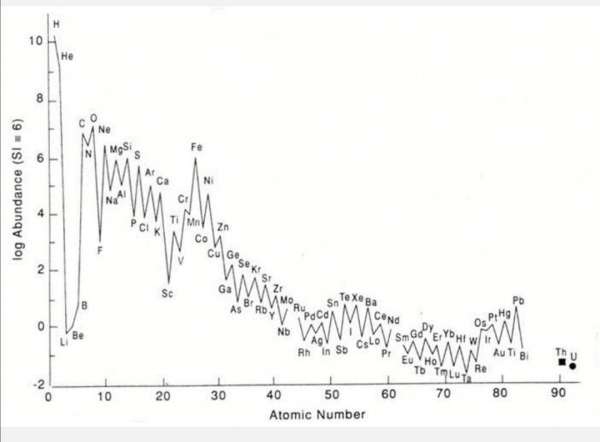 上图为宇宙中部分元素的丰度分布情况