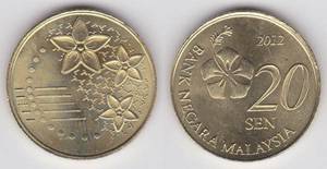 第二个是马来西亚的硬币(金色那个),面额20仙,100仙=1马来西亚林吉特,发行时间2011年至今。硬币正面是马来西亚国花“大红花”(硬币上的文字“BANK NEGARA MALAYSIA”是马来语“马来西亚国家银行”的意思);背面是3朵茉莉花。目前在钱币交易市场上价值3元人民币左右。