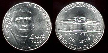 第一个是美国的硬币(银色那个),面额5美分,发行时间2006年至今。硬币正面是美国总统托马斯·杰斐逊的肖像;背面是位于美国弗吉尼亚州的杰斐逊的私人住宅蒙蒂塞洛。目前在钱币交易市场上价值4元人民币左右。