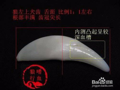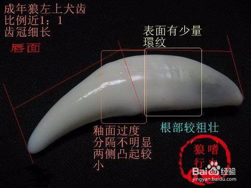2、看牙齿外形狼牙一般整体为新月形,有弧度,大多有血槽,解释下血槽,血槽是狼犬齿咬住猎物后血液顺血槽喷出,使猎物瞬间丧失抵抗力。狗牙一般齿尖较短,且畸形较多。各种奇怪的样子都有。