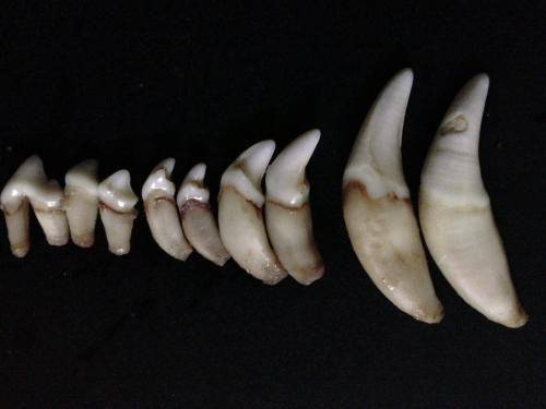 4、看牙根的型,(部分牙的尖部常有缺损)狼牙牙根较为饱满,但是满而不空,不像某些狗牙那样感觉浮肿,两侧少有凹陷,弧度匀称。雌性牙较光滑,有环纹但较狗平滑。雄性牙根部角有质感,厚实但表面不毛糙。