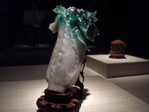 翡翠白菜原是清朝永和宫的陈设器,相传为光绪的妃子瑾妃的嫁妆之一。白菜寓意清白,象征新娘的纯洁。这棵白菜所用的物料细腻圆润、水头充分,工匠又根据原料的天然色彩雕琢出菜的白帮绿叶,在嫩绿的菜叶上仍旧趴着两条小虫,一条是螽斯,一条是蝗虫,迎合了中国人传统的多子多孙的美好愿望。这棵白菜以它出色的品质和精美的做工征服了广大观众,真可谓雅俗共赏,人见人爱,难怪在历次网络评选中,它力压举世闻名的《清院本清明上河图》和《晋王羲之快雪时晴帖》多次高票当选该院十大国宝的第一名。