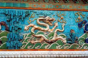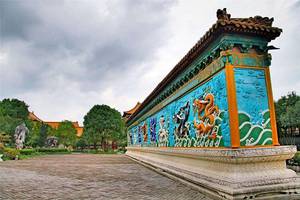 九龙壁建于乾隆三十八年,是一座长20.40米,高3.50米的高大的琉璃照壁。九龙壁的正面共由二百七十块烧制的琉璃塑块拼接而成,照壁饰有九条巨龙,各戏一颗宝珠;背景是山石、云气和海水。这是中国三大古典龙壁之一。 九龙的形体有正龙、升龙、降龙,翻腾自如,神态各异。为了突出龙的形象,采取浮雕技术塑造烧制,富有立体感;并采用亮丽的黄、蓝、白、紫等颜色;使得九龙壁的雕塑极其精致,色彩甚为华美。 九龙壁设计与装饰或明或暗地蕴藏着象征皇权和天子之尊的九五之数。因为九是阳数的最高数,五是阳数的居中数,所以九五之数就成了皇权和天子之尊的代表。九龙壁的主体有九条龙,庑殿顶设有五条脊,当中正脊上也有九条游动的行龙;九龙壁有些什么含义