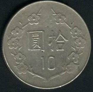 这是台湾1985年发行的10元新台币流通硬币。硬币正面是梅花和面额,背面的头像是蒋介石。硬币材质是铜镍合金。按目前汇率:10元新台币=2.081元人民币。但是按政策,境外的硬币在国内的银行都是不可兑换的。所以这枚硬币是换不了钱的。从收藏价值的角度来说,这种硬币发行量大,存世量较多,属于比较常见的硬币收藏品种,所以其收藏价值不高。目前在钱币收藏市场上,民国七十四年版的10元新台币硬币价值在6元人民币内。