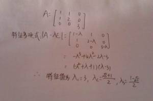 设A为n阶矩阵,根据关系式Ax=λx,可写出(λE-A)x=0,继而写出特征多项式|λE-A|=0,可求出矩阵A有n个特征值(包括重特征值)。将求出的特征值λi代入原特征多项式,求解方程(λiE-A)x=0,所求解向量x就是对应的特征值λi的特征向量。