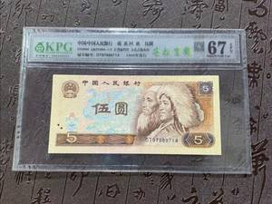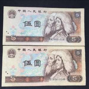1988年发行了1980年版的5元。古代货币上布满了水印。正面是藏族和回族的头像,左边是鹤劲松的画像。在古代,鹤是一鸟以下,万鸟以上,仅次于凤凰。明清一级官员的官服编织的图案为鹤。背上的景物有着吞山吞水的霸气,这种色调在第四套人民币中也很特别。