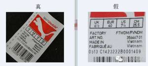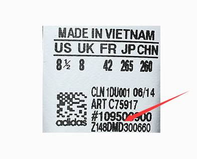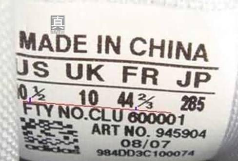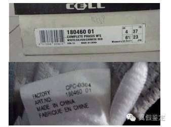 首先看到鞋标产地下面的尺码区,这行最后有个JP,下面一行应该对应的是这鞋的长度单位是毫米,再看这个数字下面的数字,关键所在,这第三行最后一个数字应该和第二行倒数第三个数字对齐,这个数字应该是2,没对齐的绝大多数是假的。
