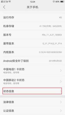 三、点击进入关于手机,找到“状态信息”一栏,点击进入。