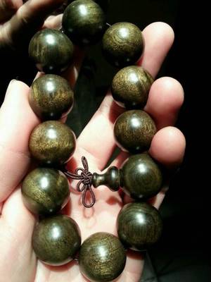 根据你的描述,这个手串是纯正的阴沉金丝楠绿料,看着密度不错,做工也不错,更好的珠子是表面带水波纹的,你这个就算是普通料子,但密度不错,网购价格在百元左右。阴沉金丝楠木手串感觉珠子很轻。是品质有问题。还是假的!谢谢!