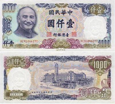 这是台湾1981年(民国七十年)台湾银行发行的1000元新台币流通纸币。纸币正面是蒋介石,背面是台北总统府。
